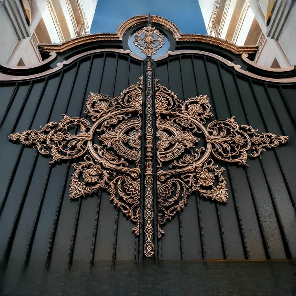 درب مدل گل آرا با طراحی فرفورژه طلایی یکی از خاص ترین طرح های کلاسیک محسوب می شود. جزئیات تزئینی آن با رنگ پتینه طلایی در تضاد با زمینه مشکی, جلوه ای لوکس و فاخر به فضا می بخشد. تمامی قطعات تزئینی با قالب ریزی دقیق ساخته شده اند تا ظاهری تمیز و یکدست ایجاد کنند. درب گل آرا به گونه ای طراحی می شود که حتی در ابعاد بزرگ, استحکام خود را حفظ کرده و دچار تاب خوردگی نگردد. استفاده از گل های فلزی برجسته و خطوط منحنی در کنار قاب فولادی ضخیم, ترکیبی از زیبایی و امنیت فراهم می آورد. این مدل برای ورودی ویلاها, باغ ها و لابی های خاص بسیار مناسب است.